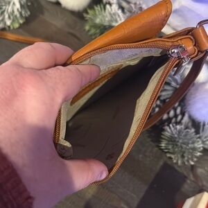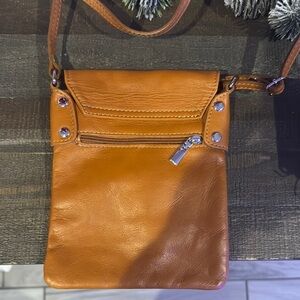 This Vera Pelle messenger bag features a warm brown color and is crafted from smooth high-quality leather, showcasing a slight sheen. Its classic design includes clean lines and a flap closure, making it a stylish yet functional accessory for carrying essentials.