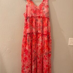Bright and colorful floral design. Sleeveless with a flowing silhouette. Ideal for warm weather outings.