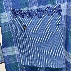 Stylish blue plaid button-up shirt with a unique pocket design. Perfect for casual wear.