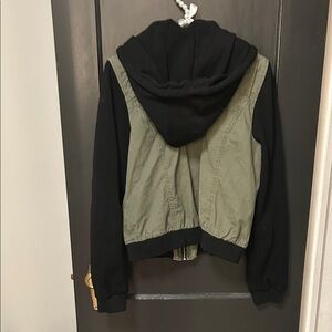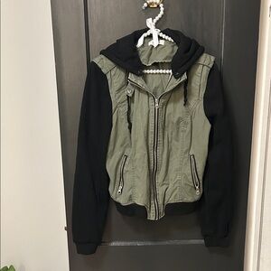 Trendy utility jacket with olive body and black sleeves. Features a hood and zippered pockets.