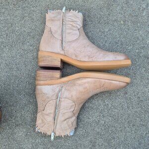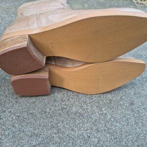New in box leather boots. Leather uppers and soles. Intentional distressing and patina Bed Stu is known for. Flame like egde detailing. Inside facing zippers. New in box. Color is called "bone" but is kind of a buff or nude/light tan. Pairs nicely with shorts and a long cardigan ala Lorelei Gilmore on laundry day as well as with dresses.