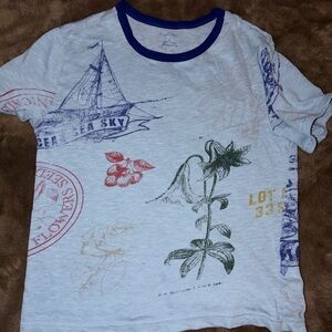 Light blue tee with artistic graphics. Soft and comfortable. Perfect for everyday wear.