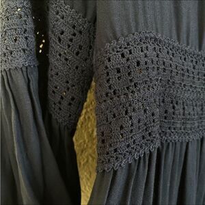 Indah Midnight Navy Blue Crochet Accent Tiered Bell Sleeve Maxi Dress Sz L is in EUC with no visible flaws