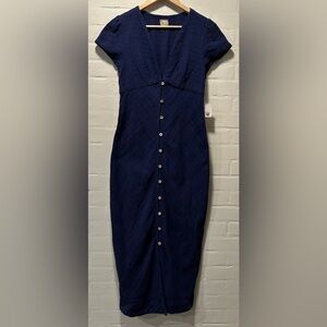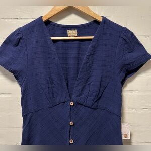 Free People New In Town Navy V-Neck Button Up Midi Boho Coastal Dress Size M