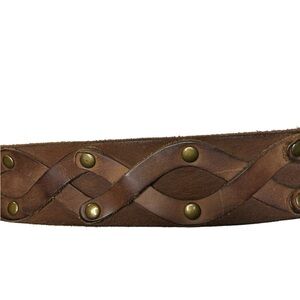 Brown Leather Belt Braided Design Gold Buckle Medium