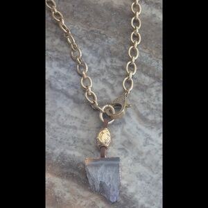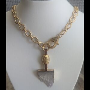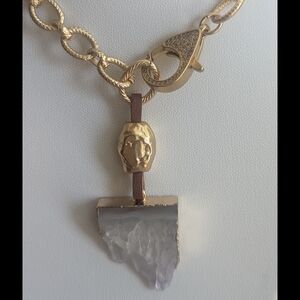 This bold gold-tone chain necklace features textured oval links and a striking genuine quartz stone slice pendant with a sculptural accent bead. Finished with a sparkling pavé lobster claw closure that doubles as a decorative front detail.