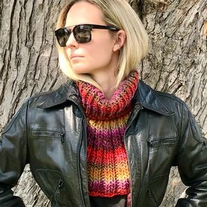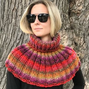 This turtleneck circular style shawl caplet scarf was hand knit with rare luxury fibers that are no longer in production worldwide. The chunky, soft airy wool fibers have an organic look & texture which stripes in a mix of warm tones of red, orange-gold, brown, fuchsia, moss green and pink. It stretches from size small to extra large. There’s no need to wrap this piece around your neck. Just pop it on over your head and you are instantly accessorized. This extraordinary and colorful piece looks the same in front and back. Wear it outdoors alone or under a roomy coat or jacket. Style it indoors over a top or dress; whether casual or dressy. Add jewelry, of course! Mona’s Collection jewelry and knitwear are sold at art shows. 🌾🐞Place your selection(s) in a bundle and include a listing of the gift wrapped with a ribbon in order to receive a private offer. 🍃Fiber Content: 100% wool. (K15-11H)