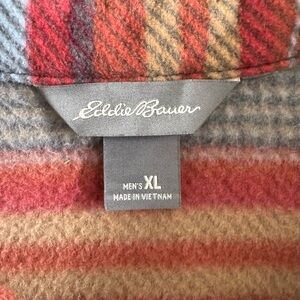 Eddie Bauer Fleece Button Down Shirt Jacket Outdoor Cozy Striped Blue Red Tan XL