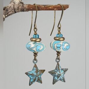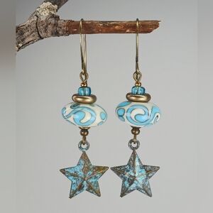HAND CRAFTED Star Dangle Earrings Turquoise Blue Lampwork Glass Patina Brass