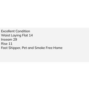 Actual Measurements (as noted on measurement card): Waist laying flat 14, Inseam 29, Rise 11