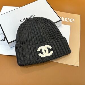 Chanel black knit beanie featuring iconic logo. Stylish and warm.