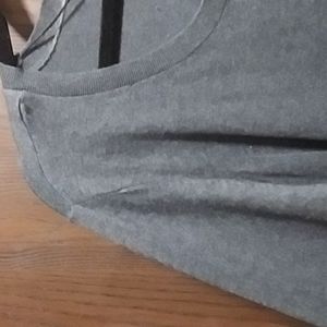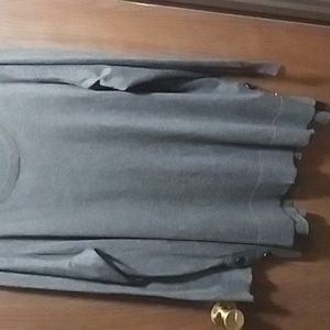 Gray scoop neck sweater from Lane Bryant. Button detail at sides of sweater. Longer length. Rayon, poly blend. Size 22/24.