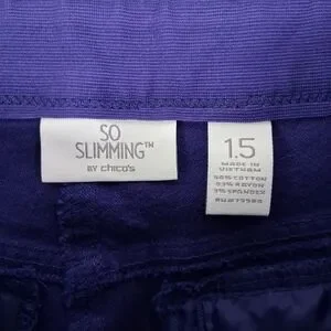 These Chicos So Slimming Women's Purple Denim Cropped Capri Jeans in tall size 1.5 offer a stylish and flattering fit. Made from dark wash denim with a relaxed fit, these jeans have a zip closure and are machine washable for easy care. The cropped capri style and solid purple color make them versatile for all seasons, while the slimming accents and features add a trendy touch to your wardrobe. Perfect for a city look or preppy vibe, these Chicos jeans are a fashionable choice for any woman.