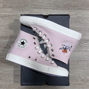 Chic Converse high-tops with delicate embroidery. Soft pink canvas for a stylish look. Ideal for everyday wear.