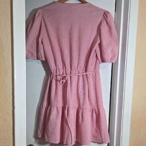 Chic mini dress with puff sleeves. Soft pink hue. Ideal for casual outings.