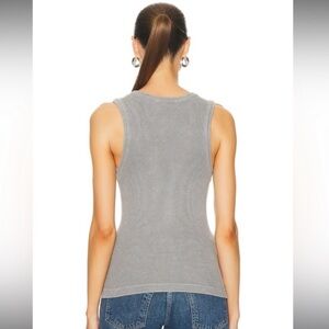 Agolde | Women’s grey ribbed Poppy scoop neck tank top. Pullover style, sleeveless. Machine wash cold, 49% Tencel lyocel, 49% organic cotton, 2% spandex. Women’s size S