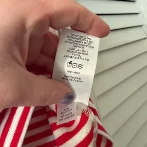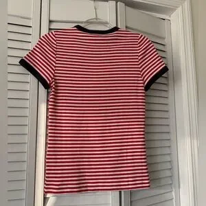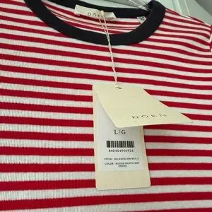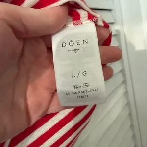 NWT DÔEN Vivi Tee in Rouge Nantucket Stripe, size L. Crafted from a soft blend of regenerative and recycled cotton, the Vivi Tee is our take on a ‘90s-style baby tee, rendered in our yarn-dyed Nantucket Stripe. It features a fitted, slightly cropped silhouette, a crew neckline, and short sleeves. Navy contrast trim at the neckline and sleeve cuffs lends a playful touch.