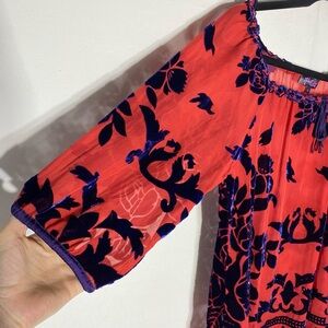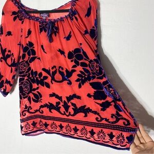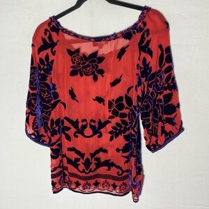 Vintage Hale Bob Semi Sheer Red and Navy Blue Beaded Velvet Silk Boho Blouse S