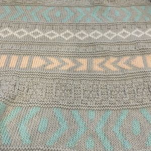 Mixed knit in colors of gray, pastel blue, peach and white.