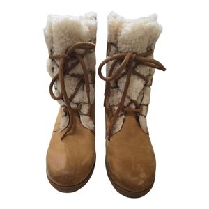 Stay cozy and stylish with these tan shearling lace-up boots. Perfect for chilly days, these boots offer both warmth and fashion-forward design.