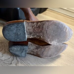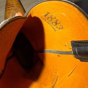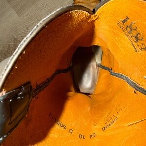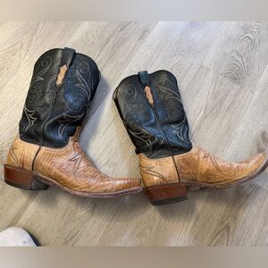 Stylish Lucchese cowboy boots. Black upper with intricate stitching. Tan leather foot with detailed design. Perfect for a classic western look. Size 10D