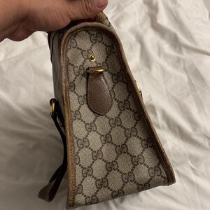 Chic Gucci tote with iconic monogram pattern. Brown leather handles. Stylish and versatile.