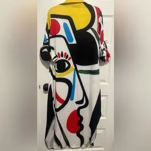 Vibrant abstract art maxi dress or duster with bold colors. Features a unique artistic design. No tags besides XL. My guess is it’s polyester. I’m honest in saying it’s not super high quality but definitely makes a statement! Three quarter sleeves with button tabs. Approximately 19 inches PTP and 52 inches shoulder to hem