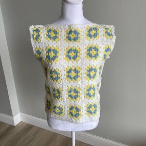 OOAK White Blue & Yellow Crochet Sleeveless Tank Women's Medium Granny 80's READ