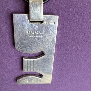 Stylish Gucci pendant with Gemini design. Crafted in silver. Hangs on a black cord. Can be unisex.