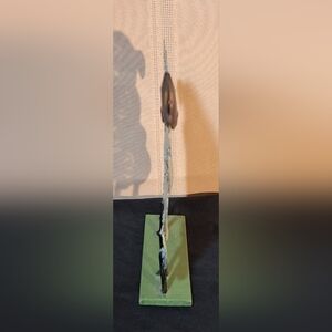 Charming sheep figurine with spiral details. Perfect for home decor. The body of the sheep is made of light sheet metal, the base is a heavier piece of iron. Approximately 6" tall, 7 1/2" long.