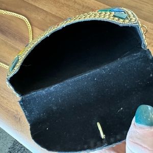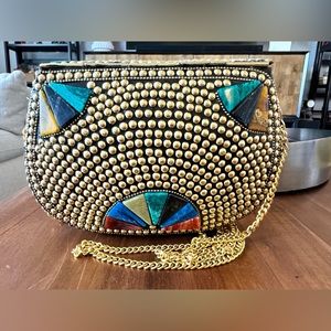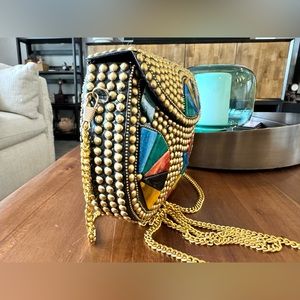 Absolutely stunning handcrafted hard case mosaic bag imported directly from Nepal. Brass studs, acrylic faux stones and gold toned chain strap. Open interior with black velvet.
