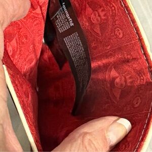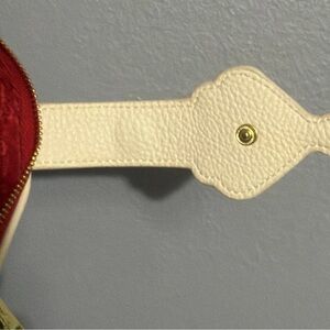 Stylish cream wallet with a striking heart embellishment. Features red and gold accents for a bold look. Perfect for adding a touch of elegance to your accessories.