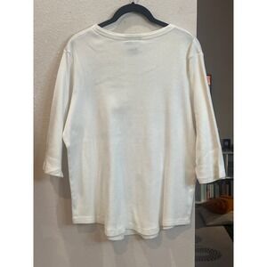 Vintage Venezia Jeans graphic top features a unique collage print of faces accented with glittery red lips and a heart. Crafted from 100% cotton in a ribbed thermal-style knit, this off-white shirt offers a comfortable fit with 3/4 length sleeves and a classic crew neckline. The artistic blue-toned photo print creates a striking Y2K aesthetic, making it a standout piece for casual wear. Made in the USA, this top combines retro charm with a bold, expressive design.