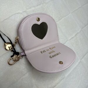 The Juicy Couture Chocolate Classic Scottie Dog Half Moon Zip-Around wallet is a stylish and practical accessory for women. Made from faux leather with a velvet fabric type, it features a heart pattern in pink and brown colors, with accents of gold hardware and embroidered logo details. The zip-around design, along with a mirror and zipper closure, make it both functional and fashionable, perfect for adding a touch of whimsy to any outfit.