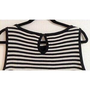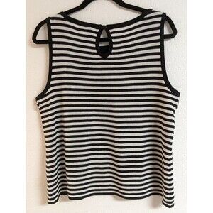 The ST. JOHN Sport Black & White Striped Sleeveless Wool/Rayon Blend Knit Top in size Large is a versatile and stylish piece suitable for various occasions such as travel, parties, casual outings, workwear, and business meetings. This pullover top features a round neckline, keyhole back accent, and wide straps, making it easy to care for and comfortable to wear. Made from a blend of wool and rayon, this lightweight and breathable top is perfect for all seasons and can be dressed up or down to suit different looks. The classic black and white striped pattern adds a touch of nautical elegance to this designer piece.