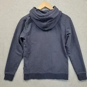 The Patagonia Ridge Rise Women's Midweight Zip Hoodie Jacket in size Small is a stylish and versatile jacket made from organic cotton. Featuring a full zip closure, drawstring hood, and pockets, this jacket is perfect for travel and casual occasions. The graphic art, zipper accent, and logo details add a touch of nature-inspired flair to the heather blue color. With a regular fit and long sleeves, this jacket is suitable for all seasons and is machine washable for easy care. A perfect layer for outdoor activities like hiking and gorpcore adventures, this jacket is a sustainable and fashionable choice for the modern woman. Note: Please see photos for condition details and measurements. Care label missing.