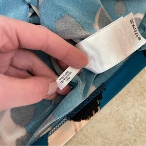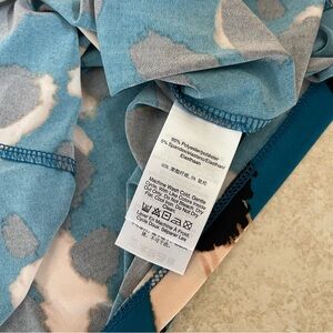 This is a Donna Karan sleeveless blouse with an animal print pattern in black and blue tones. It has a V-neckline and wide straps, and is made of a polyester and spandex blend. The blouse features ruching and is lightweight, making it suitable for travel, casual wear, workwear, and business occasions. It is machine washable and comes in a size large. The blouse has a jersey fabric type and is packable for easy transportation.
