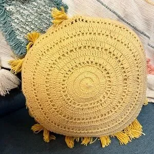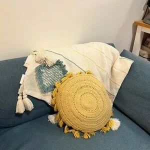White throw blanket with colorful tassels in blue, pink, and yellow. Features blue, yellow, and pink diamond patterns.
