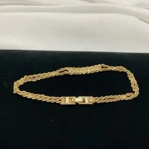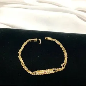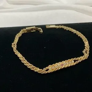 This listing is for a Vintage Gold Tone Double Chain Bracelet with CZ stones and a channel - set Ruby in it’s center. It measures between 7 1/2” to 8” in length. It is in great condition.