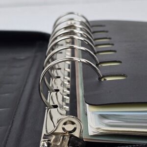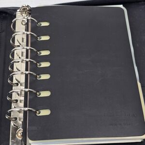 Classic Franklin Covey zip-around planner binder in black leather with a beautiful floral tapestry design. Includes assorted inserts, tab dividers, pocket sections, card holders, and a few 2016 planner pages. A timeless organizer perfect for refilling and customizing for modern use.