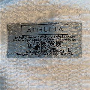 bright white athleta long sleeve top size LG. crew neck, long sleeve with thumb holes. very stretchy and soft, kind of thick material but it stays cool! very light pilling with two tiny snags on front (see last pic).