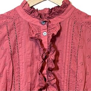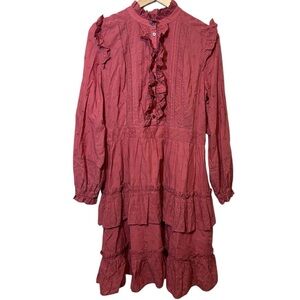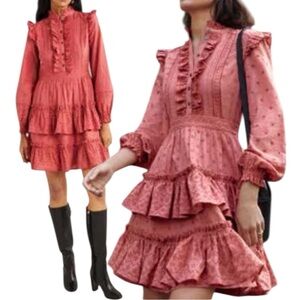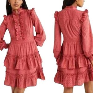 - Ruffled high neck, button front placket, ruffled long sleeves, and a tiered mini skirt.