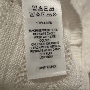 Nanette Lepore women's cardigan in size M, featuring luxurious 100% linen construction in cream/off-white color. Open front design with long sleeves and elegant pointelle knit striped detail at hem. Lightweight and breathable, perfect for layering in spring and summer. Style #75343. Classic, sophisticated look ideal for casual or dressy-casual occasions. Good pre-owned condition.
