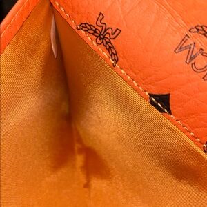 Elegant MCM clutch with signature monogram. Bold orange color. Ideal for stylish outings.Insert with chain not included. Just showing it can be used with one.