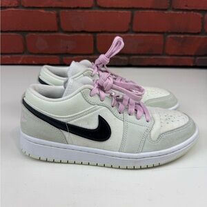 Stylish Nike sneakers with a white base and light pink laces. Perfect for casual wear. Pre Owned, Good Condition