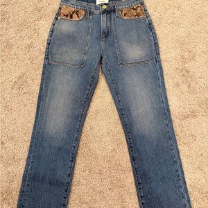 Chic denim jeans with striking snakeskin pocket accents. Elevate your style effortlessly.
