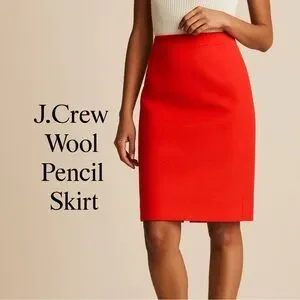 Classic and timeless J.Crew wool pencil skirt in a vibrant red. Crafted from a premium 70 percent wool and 30 percent viscose blend with a smooth 100 percent polyester lining for comfort and structure. Sleek, tailored silhouette perfect for workwear, business meetings, holiday events, and elevated everyday style. Back vent for movement. High quality, rich color, and iconic J.Crew tailoring. Style number: 46120.