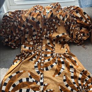 Stylish mini dress with geometric patterns. Features puff sleeves and button-down front. Perfect for a chic look. Needed a smaller size. I had lost weight.
