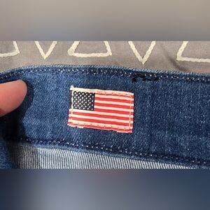Great condition. Size 31. Raw hem. Logo on back pockets. Medium wash denim with whiskering details. Measurements and fabric content listed above in pictures.