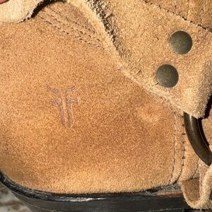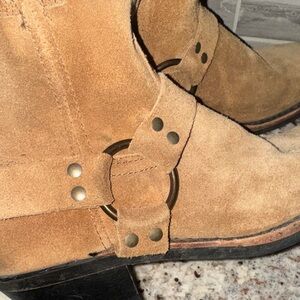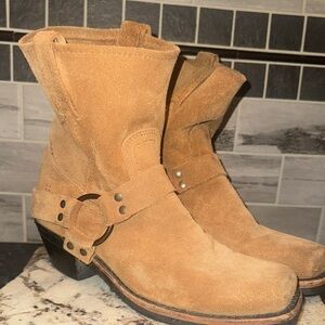 Frye suede boots with a rugged design. Features a stylish harness detail. Perfect for casual wear.